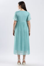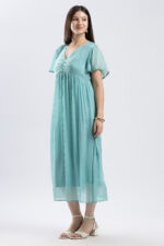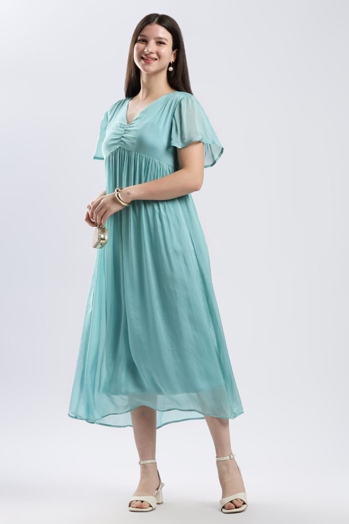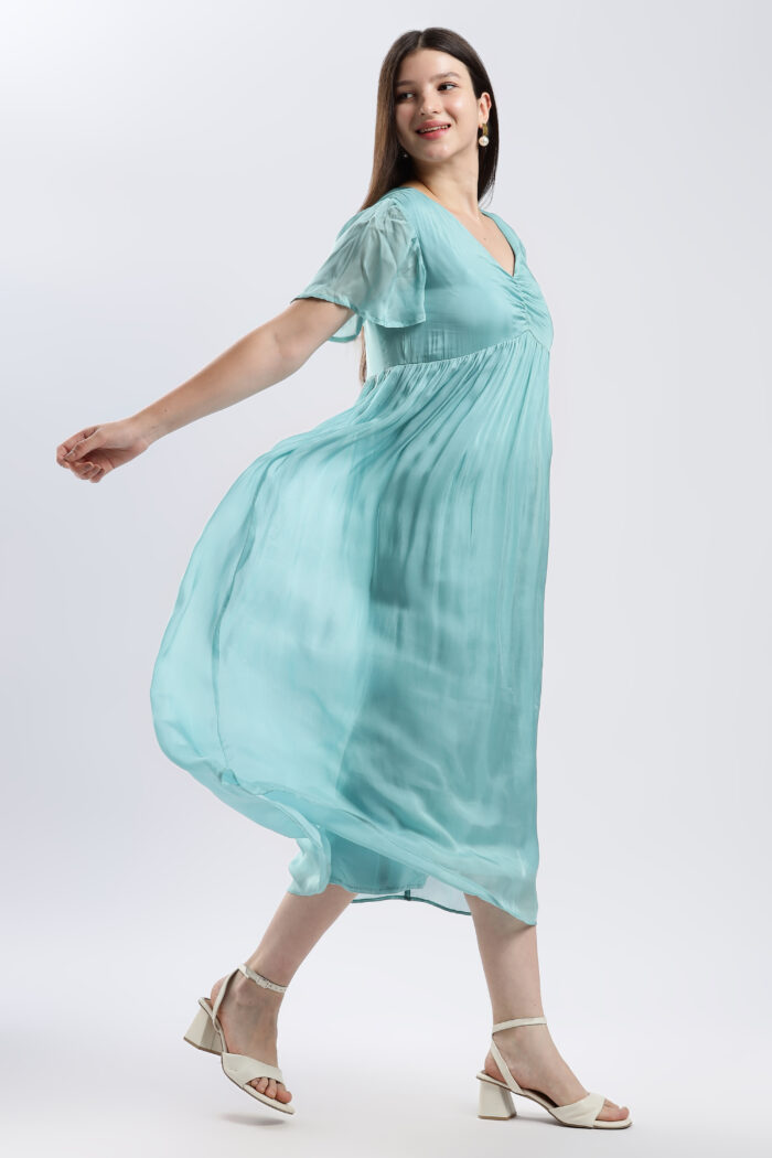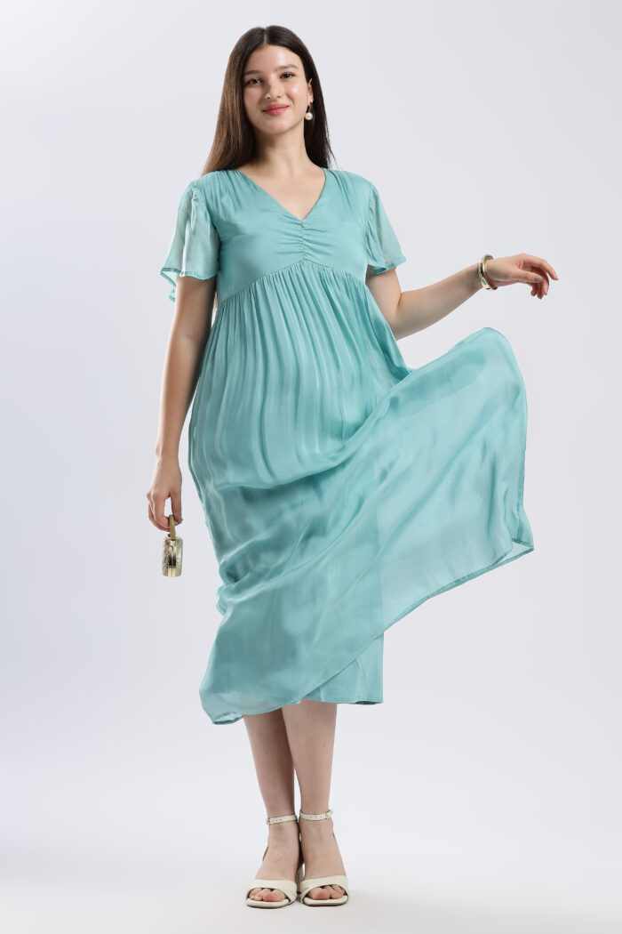 A feminine maxi with fluttery sleeves and gathered v neck detailing, crafted from shimmery silk and viscose. Beauty – meet kindness!