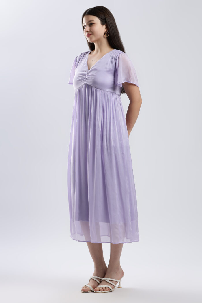 A feminine maxi with fluttery sleeves and gathered v neck detailing, crafted from shimmery silk and viscose. Beauty – meet kindness!