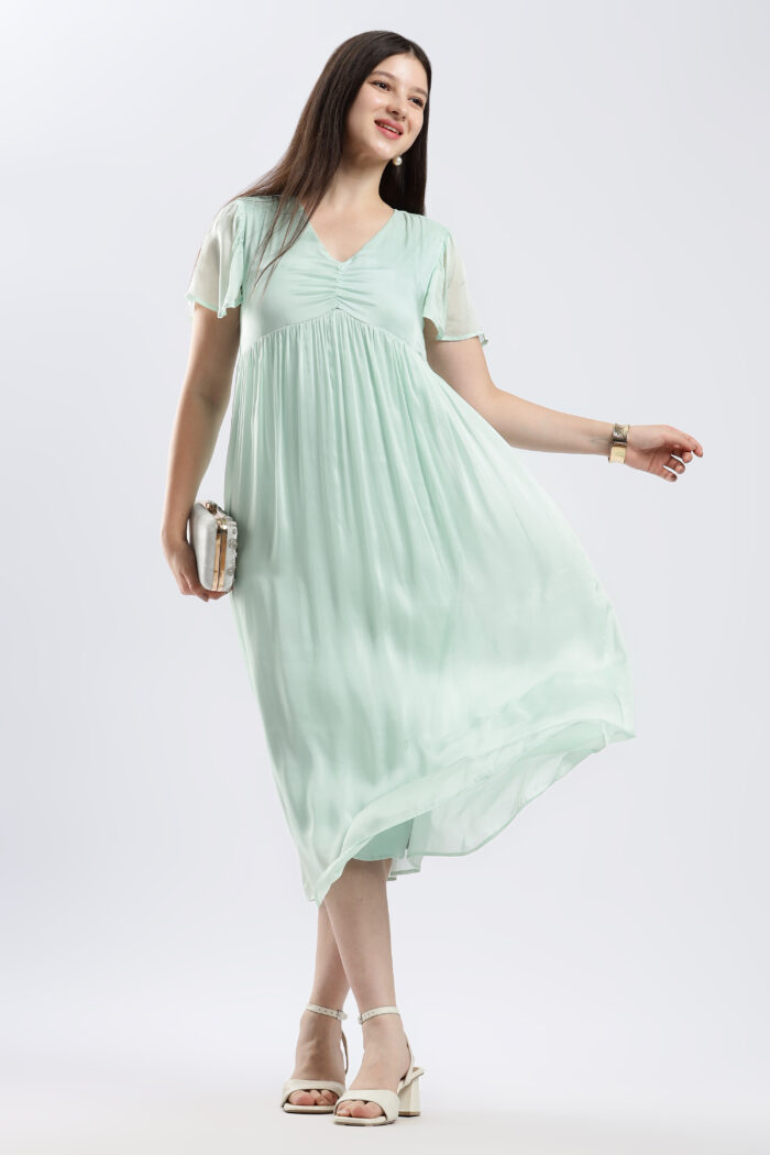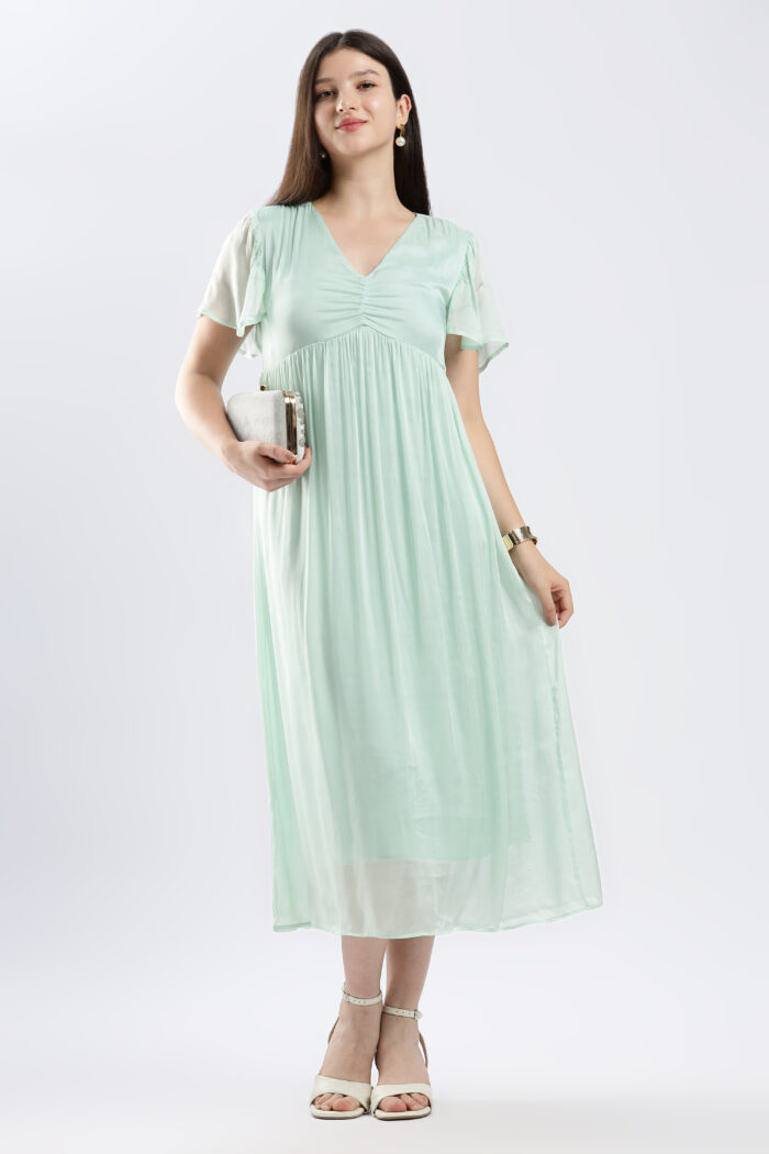 A feminine maxi with fluttery sleeves and gathered v neck detailing, crafted from shimmery silk and viscose. Beauty – meet kindness!