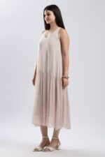 A flattering maxi dress featuring a halter neck line, back detailing and drop waist. Hand crafted from soft and luxurious silk and sustainably sourced viscose. The inner elastic layer hugs all your curves just right while the outer shimmery layer of silk flatters every body type with sophistication.